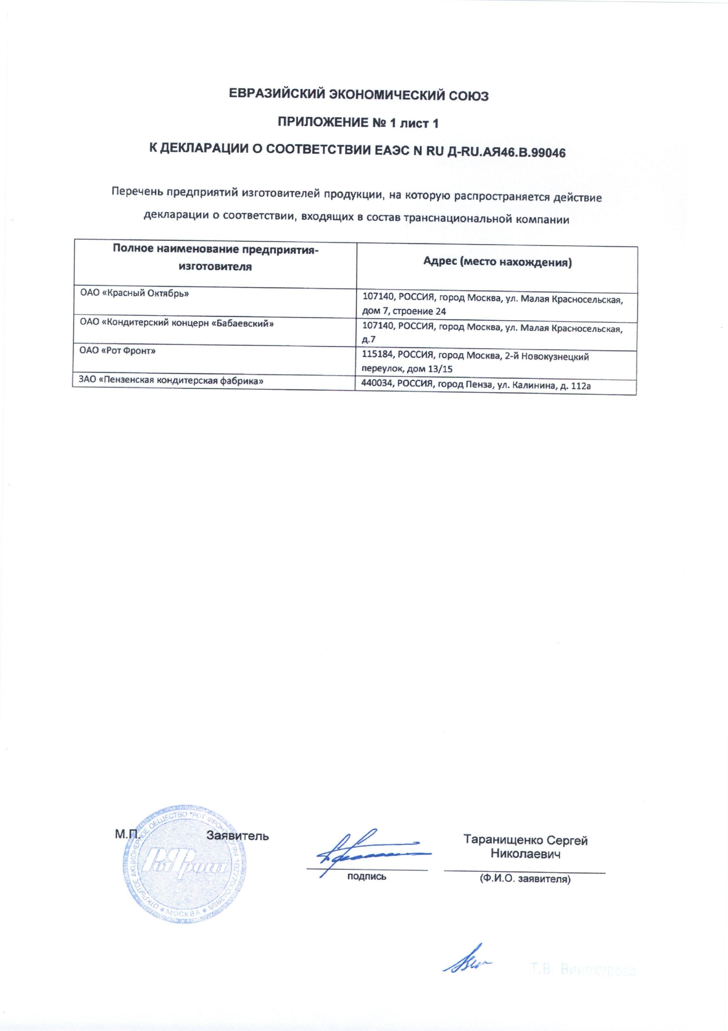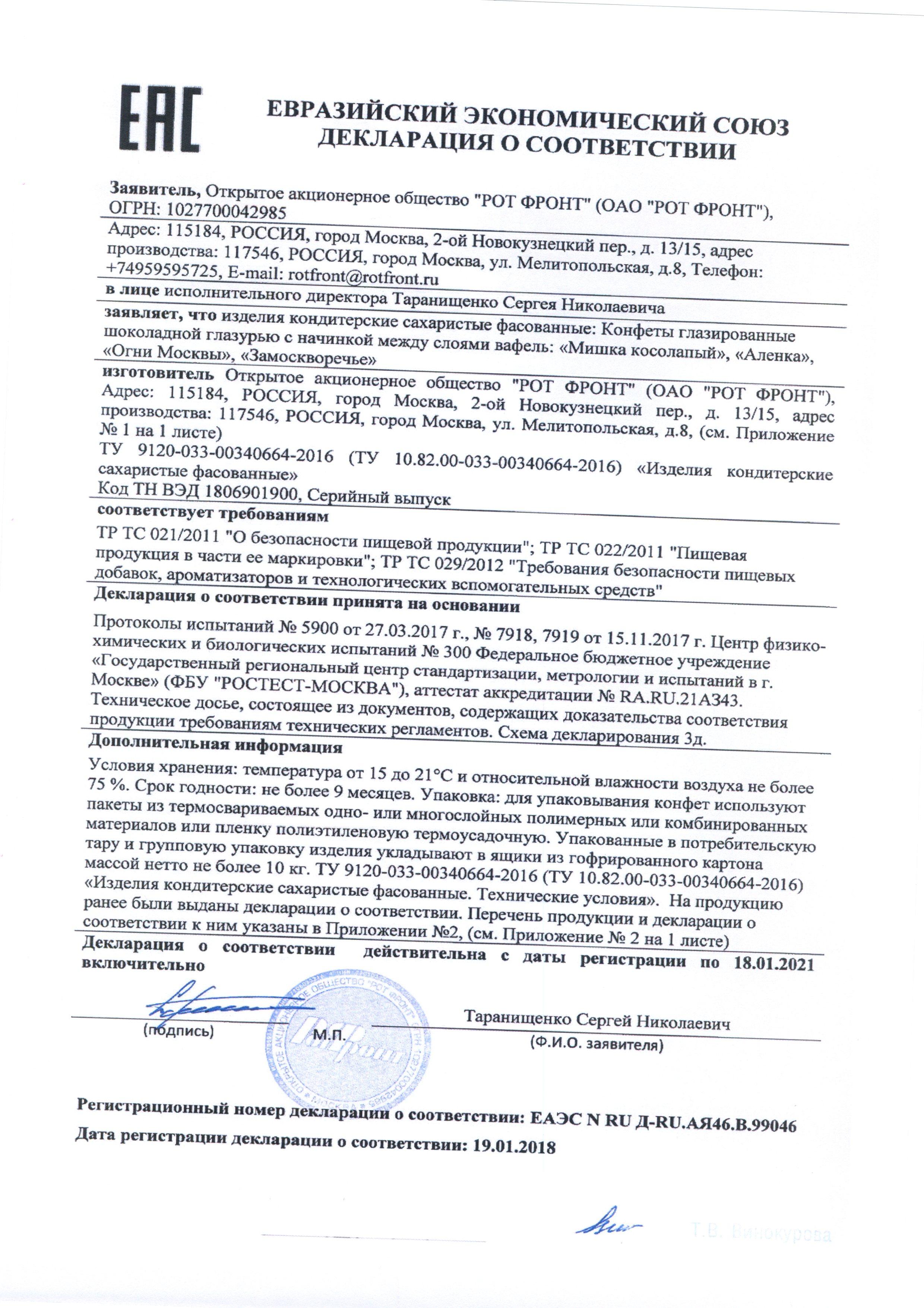 Состав: шоколадная глазурь (сахар, какао тертое, эквивалент масла какао, какао-порошок, эмульгаторы Е322, Е476, ароматизатор идентичный натуральному «Ваниль»), сахар, масло какао, вафли листовые (мука пшеничная, масло подсолнечное, соль, эмульгатор Е322, разрыхлитель сода пищевая), сухое цельное молоко, ядро ореха фундука тертое, арахис тертый, какао тертое, эмульгатор Е322, ароматизатор идентичный натуральному «Ванильно-сливочный», антиокислитель Е306. Возможно наличие незначительного количества миндаля.
