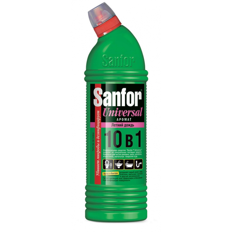 Универсальное чистящее средство Sanfor Universal Летний дождь гель 1 кг. Универсальный гель с хлором предназначен для чистки сантехники и различных поверхностей в туалетных и ванных комнатах, в кухне. Подходит для мытья полов и стен, прочистки труб. Средство имеет широкий спектр применения и способствует уничтожению болезнетворных бактерий и плесневых грибков, удалению стойких пятен. Universal 10 в 1 заменит 10 специальных чистящих средств. Гель за считанные минуты справляется с загрязнениями, помогая поддерживать порядок и гигиену. Подходит для частого применения. Устраняет неприятные запахи. Universal 10 в 1 - ваш незаменимый помощник. Экономичный расход достигается благодаря густой консистенции средства, оно равномерно распределяется и не стекает с наклонных поверхностей. Качество и свойства продукта сохраняются в течение всего срока годности. Срок годности: 18 месяцев.