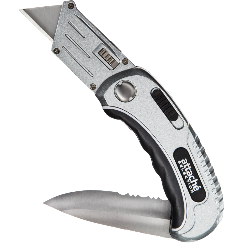 Нож универсальный многофунциональный Attache Selection 2в1 с трапециевидным лезвием. Используется для резки широкого спектра материалов: ткани, бумаги, кожи пленки и т.п. Эргономичный, надежный корпус с вставками из термопластичного каучука (TPR вставка) и ударопрочного ABS-пластика препятствуют соскальзыванию пальцев. Особенности изделия: - Корпус выполнен из цинкового сплава - устойчив к коррозии - Трапециевидное лезвие из инструментальной углеродистой стали SK5 - Лезвие изготовлено с технологией лазерной заточки, позволяющей создавать ровную и прочную режущую кромку - Складное "спортивное" лезвие из нержавеющей стали - Фиксатор складного держателя трапециевидного лезвия Характеристики изделия: - Длина ножа 104,0 мм - Ширина лезвия 19,0 мм - Длина лезвия 61,0 мм - Толщина лезвия 0,6 мм Схема замены лезвия: 1.Сдвинуть к корпусу фиксатор держателя 2.Извлечь затупившееся лезвие 3.Перевернуть его другой стороной или заменить на новое 4.Установить в держатель и отпустить фиксатор Меры предосторожности: - При работе с лезвиями используйте средства защиты - Не утилизируйте лезвия с бытовыми отходами - Хранить в недоступном для детей месте