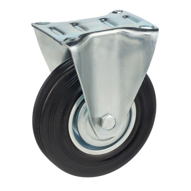 Колесо неповоротное 4002-125, диаметр 125 мм, грузоподъемность 100 кг. Колеса из черной литой резины, центр из двух гальванизированных дисков из штампованной стали. Роликовый (игольчатый) подшипник расположен в углублении, выдавленном под прессом, и содержит цилиндрические ролики подшипника. Неповоротный кронштейн изготовлен прессованием из листовой стали. Возможно применение на относительно грубых полах складов, заводов, производственных и строительных площадках. Данные колеса можно использовать на неровных поверхностях, во влажной окружающей среде и использовании вне помещения, не рекомендуется применять в среде с органическими растворителями, хлорированными веществами, гидрокарбонатами и минеральными маслами. Температура эксплуатации от -20 до +70 °С.