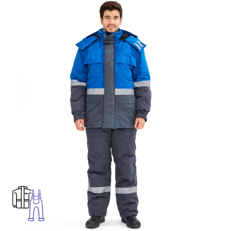 Костюм зимний "Антистат" предназначен для защиты работающих от пониженных температур и статического электричества в различных отраслях промышленности, изготавливается в соответствии с ГОСТ 12.4.303-2016 "Одежда специальная для защиты от пониженных температур. Технические требования". Костюм зимний Антистат состоит из куртки и полукомбинезона. Куртка прямого силуэта, с центральной застежкой на тесьму-молнию и двумя утепленными ветрозащитными планками: внешней и внутренней. Внутренняя планка с надставкой из флиса в верхней части. Куртка с притачной утепленной подкладкой, со съемным утепленным капюшоном. Полукомбинезон прямого силуэта, с центральной застежкой на тесьму "молния". Костюм изготовлен из антистатической ткани: 20% - п/э, 80% - х/б, с антистатичной нитью. Наличие антистатичной нити не влияет на гигиенические свойства ткани, не снижают комфортности, но способствует распределению и стеканию статического заряда электричества.