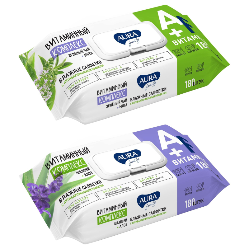 Влажные салфетки Aura Family очищают и освежают кожу, оказывают антибактериальный эффект. В состав лосьона входит витаминный комплекс A и F, а также ионы серебра. Ионы серебра обеспечивают защиту от бактерий. Витамин А поддерживает структуру и влажность клеток кожи. Витамин F защищает от сухости и шелушения. Большой упаковки хватит надолго. Формат с крышкой защитит салфетки от высыхания. Такие салфетки - незаменимое средство дома, на работе и отдыхе! Внимание! Товар поставляется в нескольких вариантах цвета/дизайна (без возможности выбора).