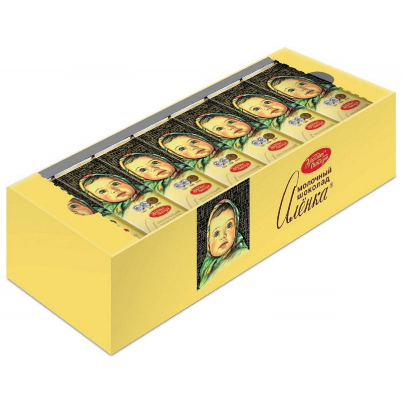 Шоколад 'Аленка' молочный. Знакомый с детства традиционный вкус российского молочного шоколада, изготовленного по рецептуре 1966 года. Состав: сахар, сухое цельное молоко, масло какао, какао тертое, эмульгаторы: лецитин соевый, Е476; ароматизаторы. 1 коробка - 64 шоколадки по 20 грамм в одной коробке. Пищевая ценность: белки - 7,0 г; жиры - 34,0 г, углеводы - 53,0 г. Энергетическая ценность: 550 ккал. Срок годности: 12 месяцев. Хранить при температуре от 15 С до 21°C и относительной влажности не более 70%. Страна производства: Россия.