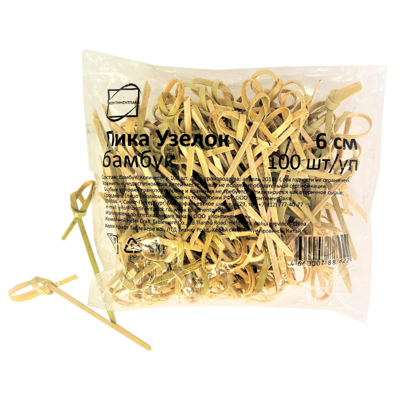 Пики для канапе КонтинентПак Узелок бамбуковые 6 см (100 штук). Деко-пики предназначены для украшения закусок, создания мини-бутербродов и канапе для организации банкетов и фуршетов. Декоративные пики (шпажки) изготовлены из высококачественных экологически чистых материалов, поэтому безопасны для здоровья человека. Материал: бамбук. Длина 6 см. В упаковке 100 штук.