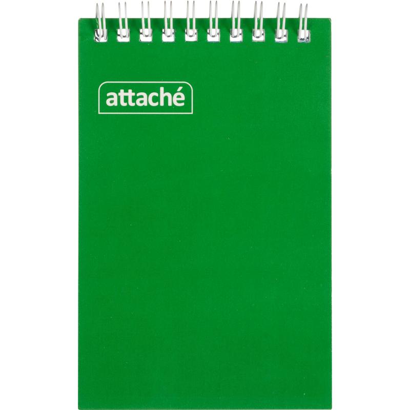 Блокнот Attache А6 формата, размер 105x145 мм. Предназначен для записей. Лицевая обложка сделана из картона 215 г/кв.м с печатью в один цвет-темно зеленый, ламинированная, возможно нанесение логотипа. Внутренний блок содержит 60 листов из офсета плотностью 60 г/кв.м белого цвета, вид линовки синяя клетка. Задняя часть обложки изготовлена из немелованного плотного картона 440 г/кв.м для более удобной (жесткой) фиксации в руке. Тип крепления евроспираль. Микроперфорации нет.