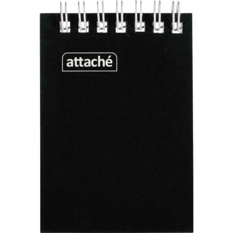 Блокнот Attache А7 формата, размер 70x100 мм. Предназначен для записей, возможно нанесение логотипа. Лицевая обложка сделана из картона 215 г/кв.м с печатью в один цвет-черный, ламинированная. Внутренний блок содержит 60 листов из офсета плотностью 60 г/кв.м белого цвета, вид линовки синяя клетка. Задняя часть обложки изготовлена из немелованного плотного картона 440 г/кв.м для более удобной (жесткой) фиксации в руке. Тип крепления евроспираль. Микроперфорации нет.