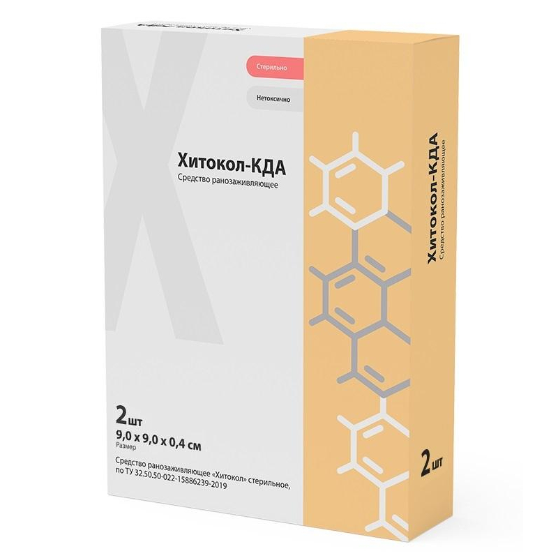 Средство ранозаживляющее 'Хитокол-КДА', предназначено для лечения инфицированных ран различной глубины (от поверхностных до глубоких), таких как ссадины, порезы, ушибленные и рваные раны, трофические язвы и пролежни, ожоги II-IIIа степени различной этиологии, а также для ускорения эпителизации очагов эрозий и язв на коже, для временного закрытия после хирургической обработки ожоговых ран IIIб степени с целью подготовки к аутодермопластике. Изделие однократного применения представляет собой пористую биодеградируемую пластину светло-коричневого цвета. Ранозаживляющее действие средства обеспечивается за счет его высокой сорбционной активности по раневому экссудату, сопровождающейся гелеобразованием. В случае нарушения целостности стерильной упаковки изделие не использовать, утилизировать с обычными бытовыми отходами класса А. Использованное средство 'Хитокол-КДА' утилизируется с отходами класса Б. Срок годности. - 3 года с даты стерилизации. Размер: 9x9x0,4 см.