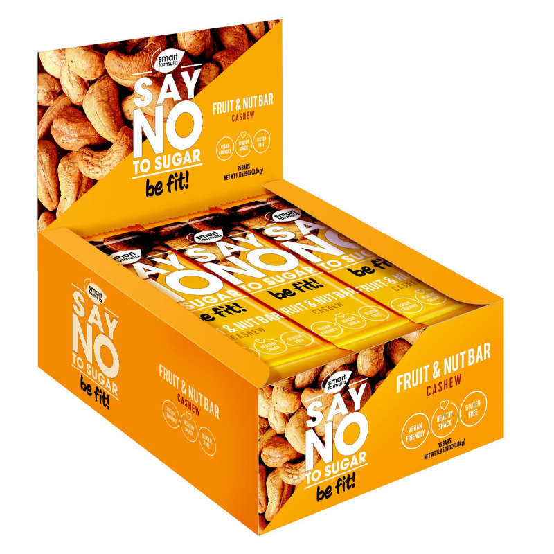 Фруктово-ореховый батончик с простым, 100% натуральным составом: только финики и орехи кешью. Батончик без добавления сахара, естественную сладость ему дарят финики, которые не зря называют 'ягодами жизни'. Финики богаты витаминами и микроэлементами, в том числе таким антиоксидант, как селен. Они быстро утоляют голод, восполняют запасы энергии, укрепляют иммунитет и повышают работоспособность. Второй ингредиент батончиков - кешью. Орехи - источник витаминов, омега-3 жирных кислот и минералов. Кешью считается чемпионом по содержанию фосфора. Батончик Smart Formula - вкусная альтернатива другим сладостям, источник сил, энергии и отличного настроения! Батончик хорошо сочетается с чаем и кофе. Его удобно брать с собой и есть даже на ходу. - Без добавления сахара; - Веганский продукт; - 100% натуральный состав. Вес: 600 г (15 батончиков по 40 г). Состав: финики сушеные, ядра кешью дробленые, загуститель гуммиарабик. Возможно наличие незначительного количества арахиса. Содержит сахара природного (естественного) происхождения. Продукт может содержать фрагменты косточек фиников. Пищевая ценность: белки - 10 г, жиры - 18 г, углеводы - 51 г. Энергетическая ценность: 410 ккал. Срок годности: 6 месяцев. Хранить при температуре от 15 °С до 21 °С и относительной влажности воздуха не более 75 %. Не подвергать воздействию прямого солнечного света. Страна производства: Россия.