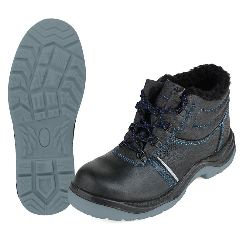 Ботинки изготовлены методом литья промежуточного слоя подошвы из полиуретана к заготовке верха обуви. На промежуточный слой из полиуретана прилит ходовой слой из термопластичного полиуретана (температурный режим от -40°С до 120°С) со стойкостью к деформациям и истиранию. Имеется пристроченная прилитая задинка. Верх ботинок из искусственной кожи. Подкладка ботинок из искусственного меха. В верхней части выполнен мягкий кант. Ботинки завязываются на шнурки и имеют глухой клапан. Шнуровка с использованием металлических люверсов. На глухом клапане мягкая вставка из поролона. Стелька вкладная. В носочной части стопы внутренний защитный подносок из металла ударной прочностью 200 Дж. На боковинах световозвращающие элементы в виде полосок. Выполнена контрастная отстрочка синего цвета в тон подкладки и цветной нити на шнурках. Подошва двухслойная (ПУ/ТПУ), маслобензостойкая. Есть внутренняя амортизирующая вставка в пяточной части подошвы. Глубина профиля ходового слоя подошвы составляет 3,5 мм. Цвет ботинок черный.