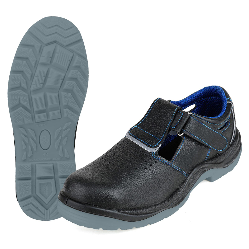 Полуботинки изготовлены методом литья промежуточного слоя подошвы из полиуретана к заготовке верха обуви. На промежуточный слой из полиуретана прилит ходовой слой из термопластичного полиуретана (температурный режим от -40°С до 120°С) со стойкостью к деформациям и истиранию. Имеется пристроченная прилитая задинка. Верх полуботинок из искусственной кожи. Подкладка полуботинок из текстильного материала. В верхней части полуботинок мягкий кант. Полуботинки имеют полуглухой клапан. Застежка с использованием ремня, проходящего через металлическую петлю, на контактную ленту велькро. Стелька вкладная. В носочной части внутренний защитный подносок из металла ударной прочностью 200 Дж. По боковым краям задинки и в нижней части полуглухого клапана световозвращающие элементы. Контрастная отстрочка синего цвета в тон цвета подкладки. Подошва двухслойная (ПУ/ТПУ), МБС. Есть внутренняя амортизирующая вставка в пяточной части подошвы. Глубина профиля ходового слоя подошвы составляет 3,5 мм. Цвет полуботинок черный.