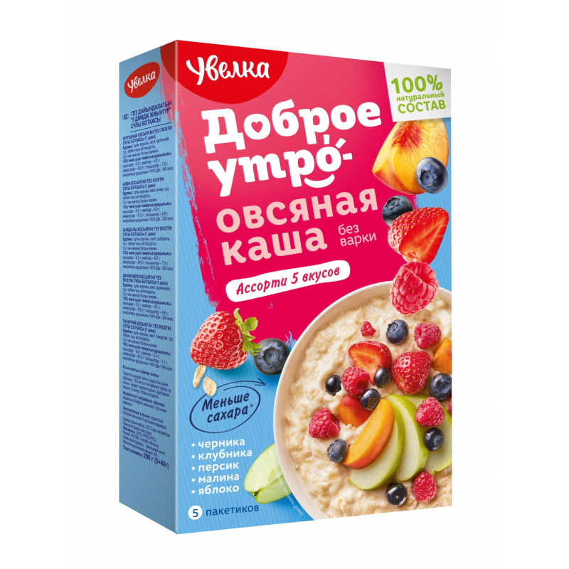 Пять пакетиков необыкновенно вкусной и полезной каши 'Увелка' позволят мгновенно приготовить завтрак для детей и взрослых! Богатый источник полноценных пищевых волокон - овсяная крупа, обработанная до тончайших пластинок, позволяет не варить кашу, а лишь залить ее горячим кипятком или молоком и оставить на несколько минут. Каша сдобрена кусочками натуральных фруктов и ягод, с которыми блюдо приобретает особенный нежный вкус и дополнительную питательность. Состав: хлопья овсяные, сахар, клубника, малина, персик, яблоко, черника, соль. Пищевая ценность: белки - 9 г, жиры - 4,5 г, углеводы - 70 г. Энергетическая ценность: 350 ккал. Способ приготовления: 1. Содержимое пакета высыпать в посуду. 2. Добавить 150 мл горячего молока или кипятка. 3. Тщательно перемешать. 4. Накрыть крышкой настаивать 5 минут. Хранить в сухом помещении при температуре не более 25°С. Страна производства: Россия. Производитель: ООО Ресурс