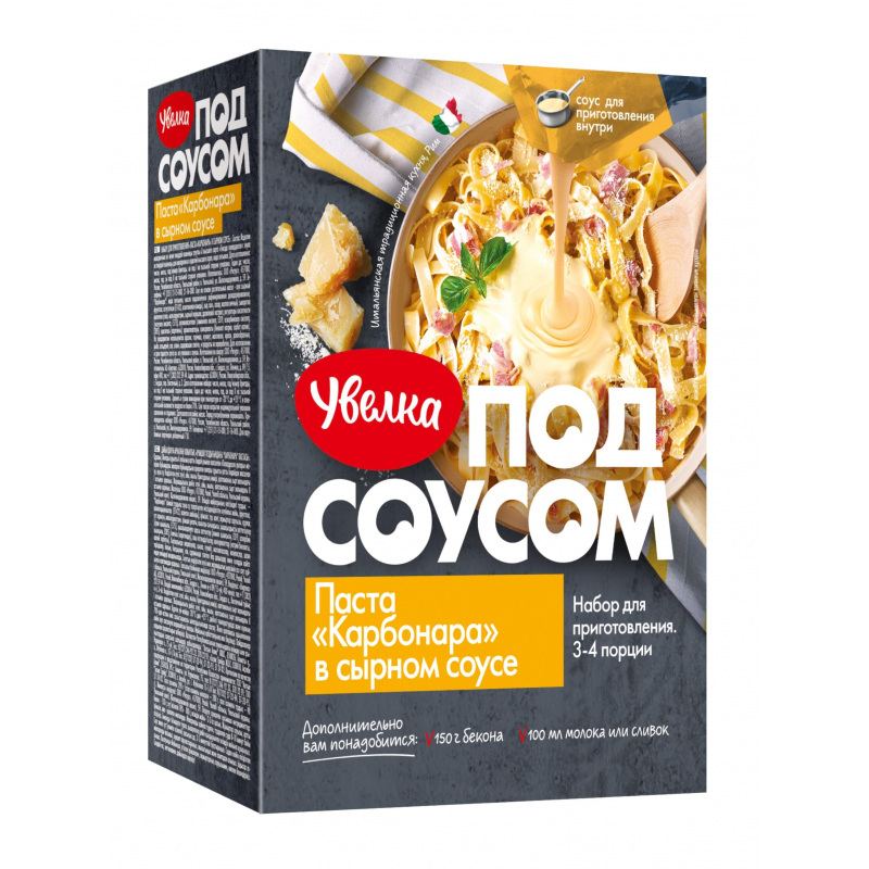 Вам не нужно будет отдельно готовить соус 'Карбонара', ведь мы уже произвели его из качественных и импортных ингредиентов по технологии, сохраняющей насыщенный сырный вкус и аромат. Состав: мука из твердой пшеницы для макаронных изделий высшего сорта, вода питьевая; соус на основе растительных масел - соус сырный 'Карбонара' (вода питьевая, масло подсолнечное рафинированное дезодорированное, фруктоза, загустители (Е1422, ксантановая камедь), сыр, соль, сахар, желток яичный, сыворотка молочная сухая, мальтодекстрин, сырный порошок, дрожжевой экстракт, регуляторы кислотности (уксусная кислота, Е575), антиокислители (лимонная кислота, Е319, аскорбиновая кислота, Е385), краситель (каротины), ароматизаторы, консерванты (бензоат натрия, сорбат калия). Пищевая ценность: белки - 8,5 г, жиры - 11 г, углеводы - 49 г. Энергетическая ценность: 230 ккал. Способ приготовления: В кипящую подсоленную воду добавьте макароны. Варите в течении 8-10 минут. Бекон нарезать ломтиками, обжарить на растительном масле до золотистой корочки. Добавьте соус, молоко (или сливки) перемешайте и тушите 2-3 минуты. Потом добавить макароны, тщательно перемешайте прогрейте и снимите с плиты. Выложите на блюдо по желанию можно добавить тертый сыр, яичный желток, зелень. Хранить в сухом помещении при температуре от минус 20°C до +25°C. Страна производства: Россия. Производитель: ООО Ресурс