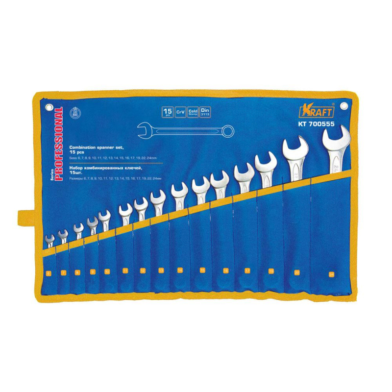Набор комбинированных ключей 15 штук Kraft KT 700555 выполнен из прочной углеродистой стали, которая выдерживает значительное усилие. Специальное хромоникилевое покрытие защищает от механических повреждений и агрессивного воздействия окружающей среды. Комплект поставляется в сумке-скрутке. Размеры: 6-17, 19, 22, 24 мм.Внешний вид и/или характеристики товара могут быть изменены производителем в соответствии с производственным процессом.