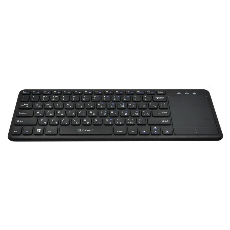 Клавиатура Oklick 830ST черного цвета не требует установки специальных драйверов и приложений, поскольку подключается к компьютеру по беспроводной связи через радиоканал, радиус действия которого достигает 10 м. Световой индикатор на корпусе подскажет, когда следует сменить батарейки. Внешний вид Классическая полноразмерная раскладка с четкими русскими и английскими шрифтами, позволяет быстро набирать текст, работать с таблицами и презентациями. Квадратные клавиши с мембранным механизмом бесшумного клика моментально реагируют на малейшее касание пальцев. Особенности Модель Oklicj 830ST отличается ультратонким дизайном, компактна, не занимает много места на письменном столе. Дополнительно предусмотрены кнопки для быстрого соединения с интернетом, а также сенсорная панель multi-touch.