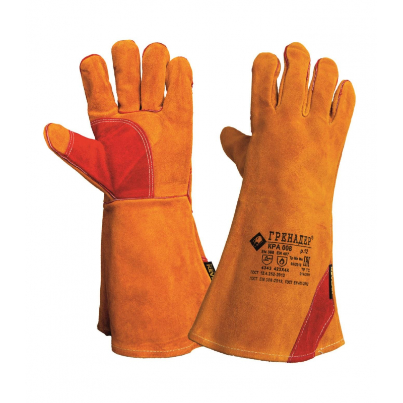 Краги Гренадер спилковые желтые - особопрочные перчатки сварщика (краги), предназначены для защиты рук от механических воздействий и повышенных температур, от искр и брызг рас-плавленного металла. Размер: 12. Краги Гренадер из цельного спилка, пятипалые, с подкладкой из брезента и хлопка. Спилок КРС специально отобранный - только спинная часть шкур, прошедших предварительный отбор, спилок однородный, сорт А+ (1,4+/- 0,2 мм), шлифованный, желтого (золотого) цвета. Швы - оригинальная нить Кевлар, усилены вставками из кожи. На ладонной части и большом пальце дополнительный слой из спилка красного цвета. Флисовая подкладка из хлопка на кистевой части и льняная (брезент) в области манжета (краги), полностью прошита по периметру, что обеспечивает лучшую защиту и высокий комфорт. Краги сварщика Гренадер обеспечивают высокую механическую защиту, защиту от повышенных температур - открытого пламени, искр и брызг расплавленного металла, высокий комфорт использования, предназначены для проведения сварочных работ, работ связанных с интенсивными механическими нагрузками в условиях повышенных температур, работ с металлом, рекомендованы для продолжительного ношения. Кроме того у краги специальная конструкция расширенного манжета для использования в зимнее время - широкий манжет позволяет заправлять рукава зимней одежды в крагу, а размер 12 позволяет применить дополнительную перчатку в качестве утепляющего вкладыша или защитного. Не использовать для тяжелых работ, связанных с риском пореза. Перчатка проницаема для жидкостей, поэтому ее не следует использовать для защиты от химикатов.