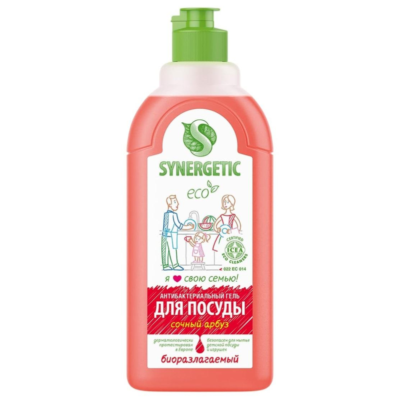 Средство для мытья посуды Synergetic Антибактериальное Сочный Арбуз 500 мл. Назначение Концентрированный антибактериальный гель для посуды Synergetic - это экологичное, безопасное и эффективное средство для мытья посуды, фруктов и овощей. Гель полностью смывается водой и подходит для мытья детской посуды, бутылочек и игрушек. Устраняет жир и запахи с посуды даже в холодной воде. Мягкие биоразлагаемые тензиды, полученные из растительного масла, удаляют органические загрязнения с посуды и обеспечивают хорошее пенообразование, не вызывая раздражения кожи рук. Средство содержит гипоаллергенные отдушки на основе эфирных масел и безопасные пищевые красители, поэтому подходит для людей с чувствительной кожей рук. Натуральный растительный глицерин в составе геля защищает кожу рук от сухости и раздражения. Гель для посуды Synergetic сертифицирован в Итальянском институте этической и экологической сертификации ICEA и имеет международный сертификат, подтверждающий биоразлагаемость, безопасность и эффективность средства на уровне лидеров европейского рынка бытовой химии. Способ применения нанести средство на очищаемую поверхность, вымыть поверхность, ополоснуть водой. При приготовлении моющего раствора используйте 5 мл средства на 5 л воды. Меры предосторожности При попадании в глаза, промыть водой. Только для наружного применения. Оберегать от детей и животных. Хранить отдельно от еды. Состав: подготовленная вода > 30%, А-тензиды (растительного происхождения) 5-15%, Н-тензиды (на основе глюкозы) 5%, глицерин (glycerol) 5%, парфюмерная композиция "Арбуз" (масла: бергамота, сантала, лемонграсса), пищевой краситель (кармуазин). Условия хранения Хранить при температуре не выше 45°С. Средство замерзает, после расмораживания и перемешивания сохраняет свои свойства.