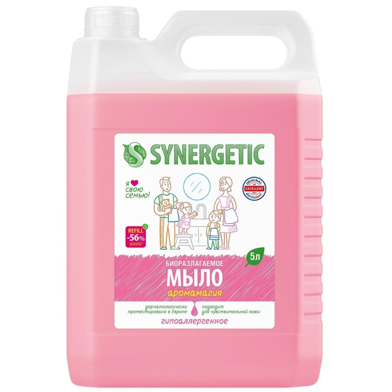Мыло жидкое Synergetic Аромамагия 5 л. Назначение Биоразлагаемое жидкое мыло Synergetic "Аромамагия" подходит для бережной очистки рук и тела от любых загрязнений. Мягкие биоразлагаемые тензиды, полученные из растительных масел, превосходно удаляют загрязнения кожи, не вызывая ее раздражения. Натуральный растительный глицерин в составе мыла защищает кожу от сухости и обеспечивает антисептический эффект, благодаря антибактериальной активности. Мультифункциональный компонент софоролипид заботится о микробиоме кожи. Гипоаллергенная отдушка на основе эфирных масел герани, нероли, жасмина, розы придает средству приятный цветочный аромат, который подходит даже для людей с чувствительной кожей. Пищевой краситель в низких концентрациях придает средству нежный розовый оттенок. Жидкое мыло подходит для септических установок. Попадая в среду септика, оно "понятно" для микроорганизмов и без труда распадается на простые соединения. Способ применения Выдавить небольшое количество мыла на влажные руки, вспенить и смыть водой. Меры предосторожности Только для наружного применения. Избегать контакта с глазами. При попадании в глаза тщательно промыть водой. Беречь от детей. Состав: Aqua (подготовленная вода с ионами серебра); Sodium Laureth Sulfate (ПАВ из пальмового масла); Sodium Lauroamphoacetate (мягкий ПАВ из пальмового масла); PEG-4 Rapeseedamide (солюбилизатор из рапсового масла); Glycerin (увлажняющий компонент растительного происхождения); Sea Salt (морская соль); Citric Acid (лимонная кислота растительного происхождения); Candida Bombicola/Glucose/Methyl Rapeseedate Ferment (ферментированный ПАВ из пшеницы и рапсового масла); Nonallergic Parfume with Natural Oils: Geranium Oil, Neroli Oil, Jasmine Oil, Rose Otto Oil (гипоаллергенная отдушка с натуральными эфирными маслами герани, нероли, жасмина, розы); Food Dye Carmoisine (пищевой краситель); Sodium Benzoate (природный консервант).
