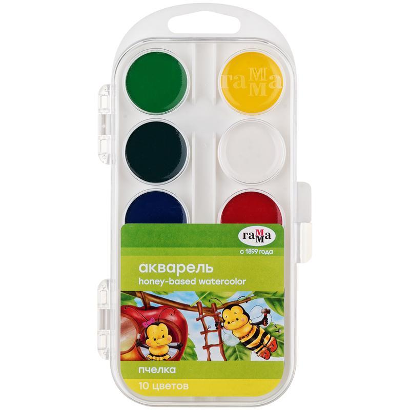 Акварельные медовые полусухие краски Гамма 'Пчелка', 10 цветов. В набор входит краска белого цвета. Краски в пластиковой коробке с европодвесом содержат стойкие и яркие пигменты, что позволяет получать насыщенные изображения с эффектом бархатистости цвета. Краски изготовлены с добавлением натуральной патоки и пчелиного меда. Кисточка в комплект не входит. Акварель отличается чистотой и прозрачностью тонов, легкостью получения новых оттенков (смешивание, наложение слоев друг на друга). Не токсична, легко смывается с рук и одежды. Размер упаковки (ДxШxВ): 180x90x20 мм. Объем краски одного цвета в кювете - 3,5 куб.см.