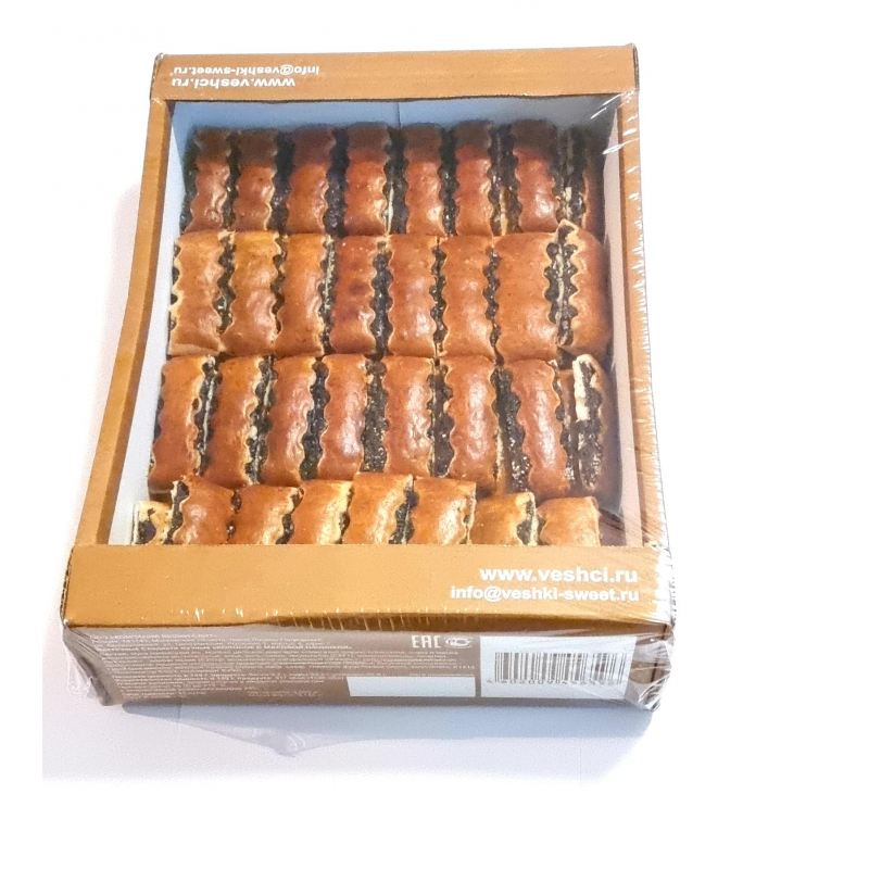 Нежное сдобное тесто и много сладкой маковой начинки - понравится каждому любителю выпечки! Состав: мука пшеничная в/с, молоко цельное,, маргарин сливочный (масло сливочное, жиры и масла дезодорированные растительные, вода, соль, сахар, эмульгатор (Е471), моноглицериды, лецитин, консервант - сорбат калия (Е202)); ароматизатор натуральный 'Ваниль', соль поваренная пищевая, ароматизатор пищевой натуральный (ванилин), разрыхлитель сода пищевая, регулятор кислотности - лимонная кислота, маковая начинка (семена мака, сахар, глюкозно-фруктозный сироп, загуститель Е1414, стабилизатор Е333, консервант Е202). Вес: 3000 г. Пищевая ценность: белки - 5,7 г, жиры - 33,2 г, углеводы - 50,8 г. Энергетическая ценность: 317 ккал (1326 кДж). Хранить строго в закрытой упаковке при температуре от +6°C до +18°C и относительно влажности воздуха 75%. Страна производства: Россия. ГОСТ Р 50228 - 92