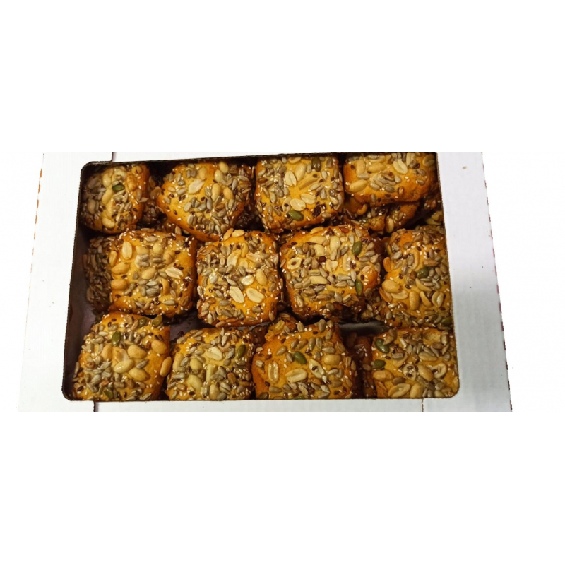 Песочное печенье с арахисом и изюмом, с семенами льна, тыквы, подсолнечника, кунжута. Питательно и очень полезно! Состав: мука пшеничная в/с, яйцо куриное, маргарин (рафинированные дезодорированные растительные масла (пальмовое, модифицированное пальмовое, пальмоядровое, модифицированное масло ши) вода, эмульгаторы (Е471, Е433, соевый лецитин Е322), консерванты (Е200,Е211), ароматизатор краситель (Е160а), регулятор кислотности (Е330), молоко сухое обезжиренное, семя льна, тыквенное семя, семя подсолнечника, кунжут, изюм, арахис, сахар, соль. Пищевая ценность: белки - 3,34 г, жиры - 14,78 г, углеводы - 47,52 г. Энергетическая ценность: 317 ккал, 1325 кДж. Хранить при температуре (18 + 3)°С и относительной влажности воздуха не более 75%. СТО 34154074-002-2018