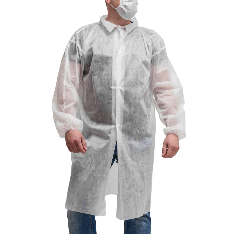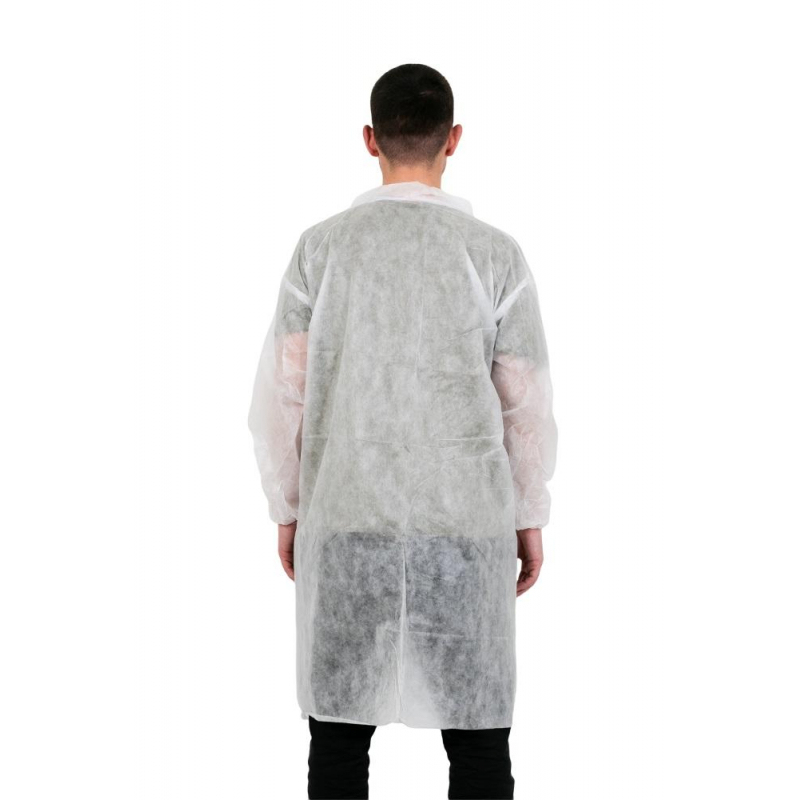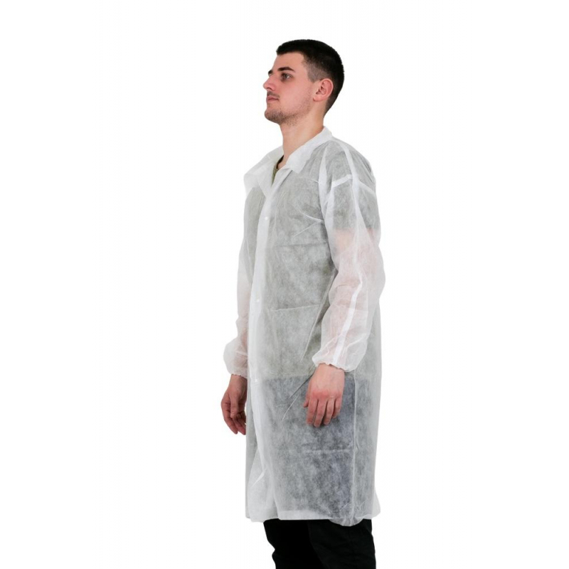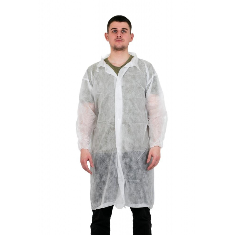 Одноразовые процедурные халаты предназначенные для процедур осмотра пациентов с целью предохранения пациента и медицинского работника от переноса микроорганизмов, используются в медицине, косметологии, салонах красоты и здоровья. Потенциальные потребители: работники и посетители учреждений здравоохранения и косметологии. Халаты выпускаются в нестерильном виде, производятся из гипоаллергенных материалов с учетом всех санитарно-гигиенических требований. Халат на кнопках, размер - XXL. Длинный рукав халатов собран на резинке. Цвет - белый.