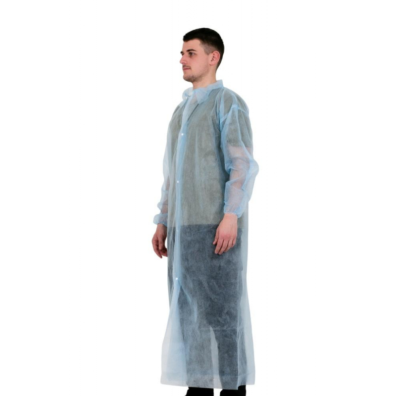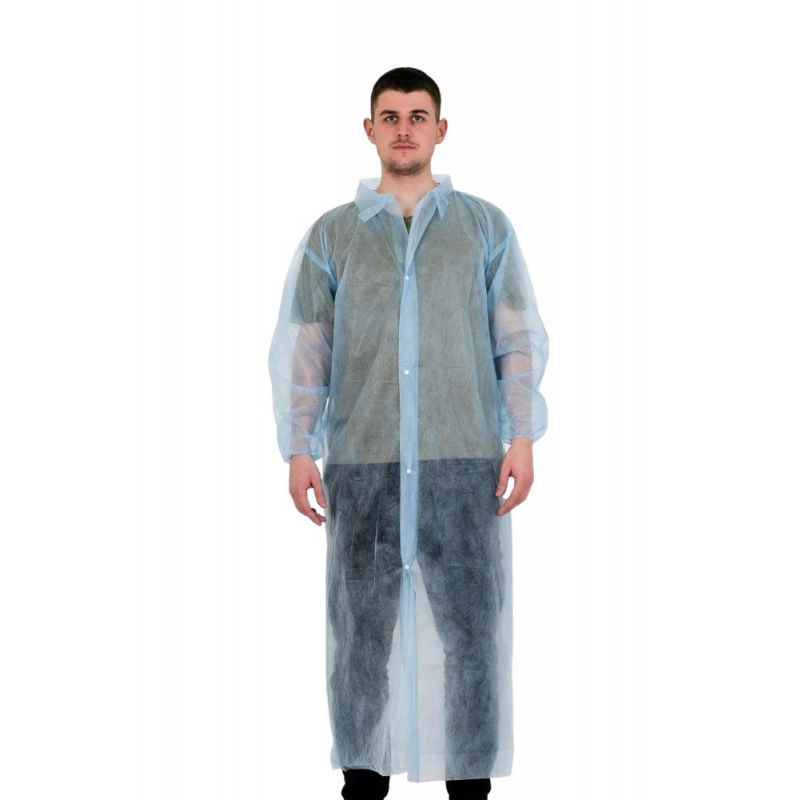 Одноразовые процедурные халаты предназначенные для процедур осмотра пациентов с целью предохранения пациента и медицинского работника от переноса микроорганизмов, используются в медицине, косметологии, салонах красоты и здоровья. Потенциальные потребители: работники и посетители учреждений здравоохранения и косметологии. Халаты выпускаются в нестерильном виде, производятся из гипоаллергенных материалов с учетом всех санитарно-гигиенических требований. Халат на кнопках, размер - XXL. Длинный рукав халатов собран на резинке. Цвет - голубой.