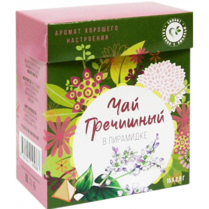 Напиток чайный Гречишный чай в пирамидках 37,5 г (15x2,5 г). Аромат содержит нотки ванили и напоминает свежее овсяное печенье. Известен высоким содержанием рутина, укрепляющего стенки сосудов. С помощью гречишного чая борются с воспалением, лишним весом, усталостью, недомоганием. Тонизирует и выводит шлаки из кишечника. Состав: гречиха татарская. Количество пакетиков в упаковке: 15 штук. Способ приготовления: пирамидка на стакан (кружку) горячей воды. Заваривать 5-7 минут. Тип упаковки: картонная. Хранить в сухом чистом месте, защищенном от прямых солнечных лучей, отдельно от сильно пахнущих веществ, при относительной влажности не более 70%. Страна производства: Россия.