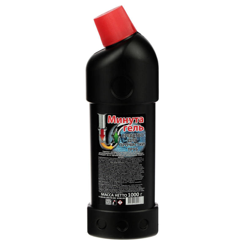 Средство для прочистки труб Минута гель 1000 г Удаляет засоры и неприятные запахи в канализационных трубах, раковинах и сифонах. Очищает их от органических загрязнений, жира и волос. Способ применения: Перед применением флакон с закрытой пробкой энергично встряхнуть! Залить содержимое флакона (0,5 кг) в сливное отверстие. Оставить на 1-2 часа. Промыть сильной струей воды. Меры предосторожности: Осторожно! При попадании на кожу и в глаза вызывает выраженное раздражение. Перед использованием ознакомиться с маркировкой продукта. Использовать только по назначению. При работе со средством использовать резиновые перчатки. После работы тщательно вымыть руки. Не смешивать с другими средствами. Избегать попадания средства в глаза и на кожу. При попадании средства на кожу немедленно промыть чистой водой. В случае попадания средства в глаза - немедленно длительно (15 мин) промыть их чистой проточной водой. При необходимости обратиться к врачу. Состав: вода, гидроксид натрия, менее 5% анионного ПАВ, глицерин. Условия хранения: Хранить в плотно закрытой таре, отдельно от пищевых продуктов, в недоступном для детей месте. Хранить и транспортировать при температуре не ниже -30С и не выше +25С. Срок годности: 36 месяцев.
