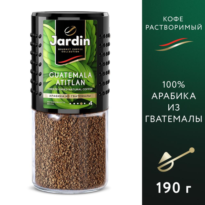 Кофе растворимый сублимированный Jardin Guatemala Atitlan - это 100% натуральный кофе, созданный из моносортов высококачественной арабики из Гватемалы. В Гватемале выращивают сбалансированный и ровный по вкусу кофе. Этот сорт отличает приятная сладость послевкусия с фруктовыми оттенками. Состав: 100% натуральный кофе. Степень обжарки: темная. Вид кофе: растворимый, сублимированный. Способ приготовления: добавить в чашку 1-2 чайные ложки кофе и залить горячей, но не кипящей водой. Вес: 190 г. Тип упаковки: стеклянная банка. Условия хранения: плотно закрытую банку хранить в сухом прохладном месте. Страна производства: Россия.