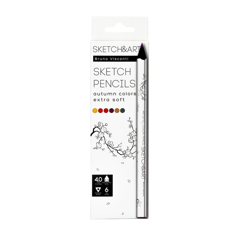 Великолепный набор скетч-карандашей SKETCH&ART. В белой картонной коробке с покрытием SoftTouch собраны 6 оттенков для создания осенних пейзажей. Толстый корпус карандаша (диаметром 10 мм). Карандаш удобно держать в руках даже в перчатках, делая наброски осеннего пейзажа или морозного рассвета. Мягкий грифель диаметром 4 мм профессионального уровня высоко оценят опытные художники, а для новичка такое качество станет вдохновляющим началом творческого пути. Карандаш легко скользит по бумаге, не царапая ее поверхность, но при этом позволяет рисовать ярко и насыщенно или делать плавные переходы и градиенты. Скетч-карандаши SKETCH&ART - это уникальный продукт на рынке. Ведь ко всему прочему, они выполнены из черного термообработанного дерева, окрашены в несколько слоев, имеют окрашенный диппинг, а так же авторский принт на корпусе.