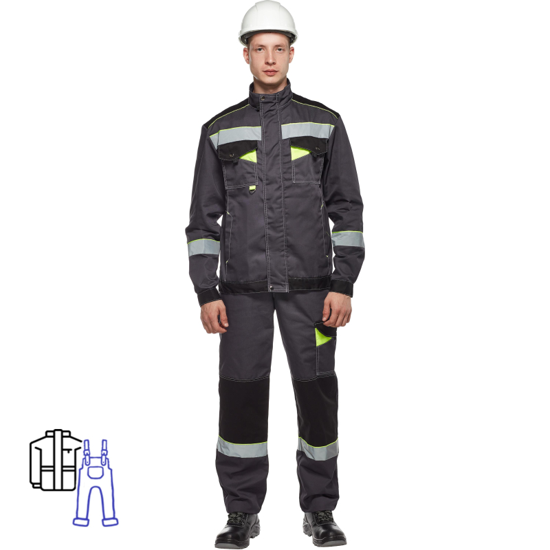 Костюм рабочий летний Корвет с СОП (куртка+полукомбинезон). Размер: 44-46. Рост: 182-188. Ткань: "Орион" смесовая с водоотталкивающей отделкой. Состав ткани: 65% полиэстер, 35% хлопок. Плотность ткани: 240+10 г/кв.м. - Нагрудные накладные карманы с фигурными клапанами на кнопках,нижние карманы в рельефных швах полочек. - Усилительные накладки в области локтей. - Куртка на поясе с фигурной линией низа по спинке. - Полукомбинезон с различными многофункциональными карманами. - Застежка гульфика на молнию и в правом боковом шве на пуговицы. - Эластичная резинка по спинке талии. - Бретели на пластиковых застежках (фастексах), регулирующиеся по длине за счет эластичной резинки. - Держатель полукольца в куртке и полукомбинезоне. - В костюме используется светоотражающая полоса 50 мм и декоративные элементы контрастного цвета. Сферы применения: строительство, ЖКХ, сервисные службы.
