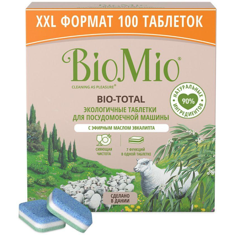 Таблетки для посудомоечных машин BioMio Bio Total (100 штук в упаковке). Назначение: экологичные таблетки для посудомоечной машины Bio-total с эфирным маслом эвкалипта эффективно и деликатно, с заботой о посуде удаляют самые стойкие загрязнения даже при низких температурах, придавая дополнительный блеск и сияние стеклу, нержавеющей стали, нейтрализуя запахи. Таблетки быстро растворяются в воде, смягчая ее, тем самум предупреждая образование известкового налета, способствуя более надежной и долговечной работе машины. Не содержит фосфаты, агрессивные ПАВ, SLES, ЭДТА, ДЭА, хлор, искусственные ароматизаторы. BioMio - линейка эффективных средств для дома, использование которых приносит удовольствие. Продукты, созданные с любовью и заботой, идеально справятся с загрязнениями, оставаясь при этом абсолютно безопасными, экологичными и особенно незаменимыми, если в доме есть малыш. Способ применения: промойте сильно загрязненную посуду. Положите 1 таблетку в предусмотренное отделение вашей посудомоечной машины. Выберите соответствующую программу для мытья посуды и запустите машину. Подходит для разных температурных режимов (50-70 °С). В регионах с жесткой водой добавьте соль и ополаскиватель в машину. Не рекомендуется мыть в посудомоечной машине антикварный и расписной фарфор, хрусталь, изделия из декоративного стекла, предметы с ручками из кости, деревянную посуду и пластиковые изделия, которые не выдерживают температуру выше 70 °С, алюминиевые изделия и предметы с отделкой золотом или другими драгоценными металлами. Меры предосторожности: при попадании с глазами немедленно промыть большим количеством воды и обратиться за медицинской помощью. При обращении к врачу иметь при себе упаковку продукта или этикетку. Не глотать. При попадании в полость рта обратиться к врачу. Хранить в местах, недоступных для детей. Состав: 15-30% кислородный отбеливающий агент; 5% поликарбоксилаты, неионогенные ПАВ, натуральная отдушка - эфирное масло эвкалипта, энзимы, лимонен. Условия хранения: в сухом месте, избегать попадания прямых солнечных лучшей. Беречь от детей. Срок годности: 24 месяца.