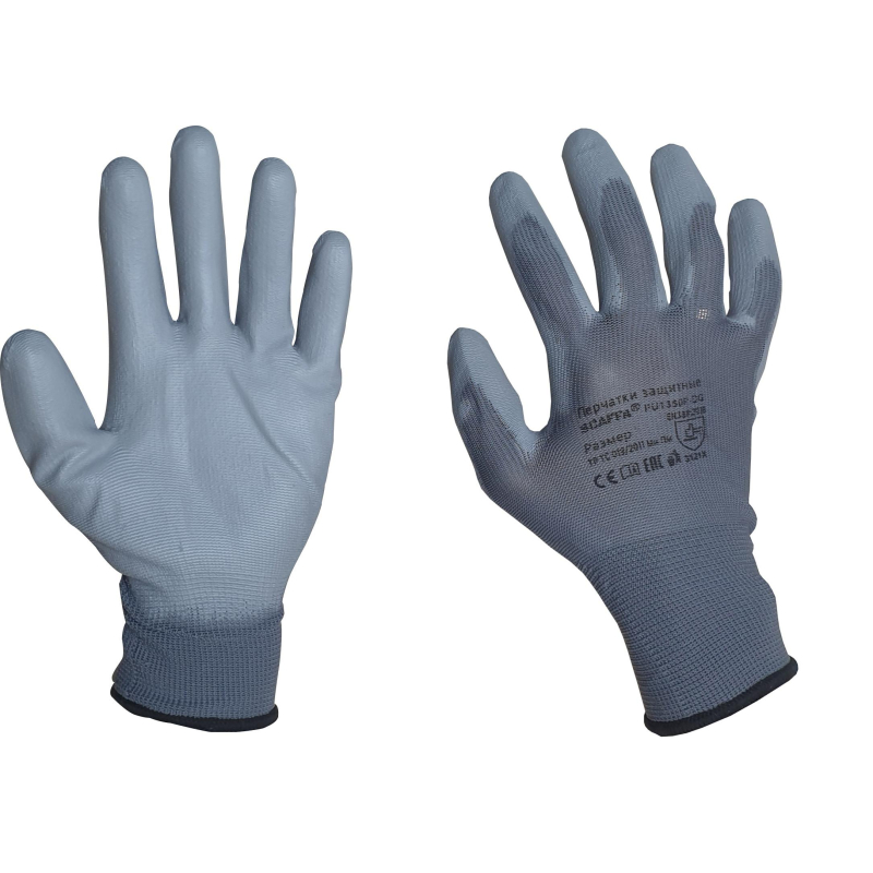 Перчатки рабочие нейлоновые с покрытием из полиуретана. Размер: 8, М. Количество в упаковке: 1 пара. Основа: нейлон. Покрытие: полиуретан. Вид покрытия: ладонь и напалки с тыльной стороны (не полный облив один слой). Манжет: удлиненный напульсник с цветовой индикацией размера. Длина: 230 мм. Бесшовная 'дышащая' основа из нейлона с плотностью вязки 13 петель на дюйм, обеспечивает высокую чувствительность. Легкое покрытие из полиуретана дает надежный захват сухих и влажных поверхностей. Перчатка комфортна в использовании даже при длительном ношении. Перчатки прекрасно подходят для использования при строительных работах, работе с инструментом и общехозяйственных работах. Удлиненный манжет мягко облегает запястье защищая его и предотвращает попадание мусора и вредных веществ внутрь перчатки. Защитные свойства по EN388: 2016: 3121X.