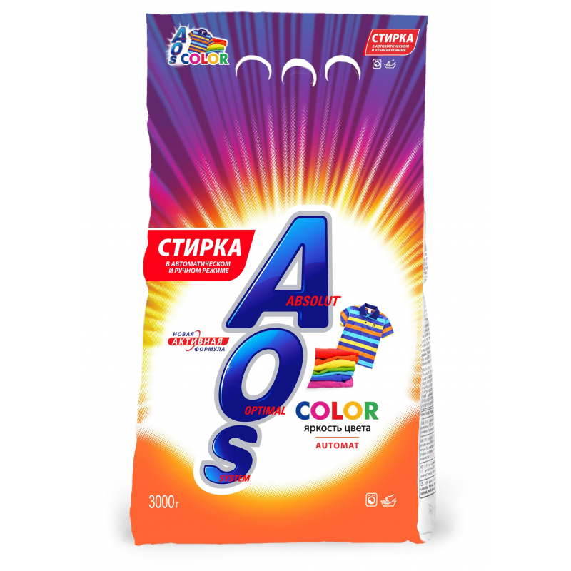 Порошок стиральный автомат AOS Color 3 кг. Назначение: AOS - комплексный подход к стирке. Новый класс энзимов и усиленная система еще лучше справляются со сложными загрязнениями и сохраняют форму одежды при пониженных температурах стирки. Способ применения: насыпьте необходимое количество порошка в соответствующее отделение стиральной машины перед началом стирки. Подробная информация о дозировке указана на упаковке. Меры предосторожности: при попадании на слизистую оболочку или в глаза, промыть их водой. При повышенной чувствительности или повреждениях кожи избегать длительного контакта с моющими растворами. Состав: 5% или более, но менее 15%: анионные ПАВ; менее 5%: неионогенные ПАВ, мыло (соли жирных кислот), поликарбоксилаты, энзимы, ароматизирующая добавка. Условия хранения: хранить в сухом помещении, предохраняя от влаги и прямых солнечных лучей, вдали от отопительных приборов, при температуре не выше +35 °С и относительной влажности воздуха не более 95 %. Вдали от пищевых продуктов; в недоступном для детей месте. Срок годности: 24 месяца.