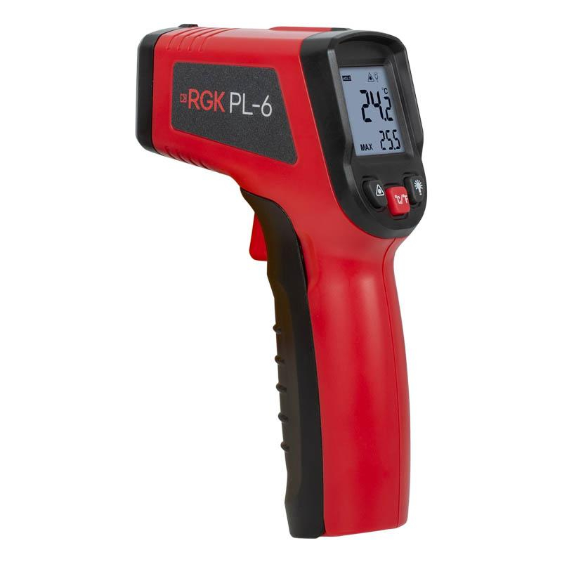 Данный прибор настроен в широком температурном диапазоне и предназначен исключительно для измерения температуры поверхностей строительных материалов, не предназначен для измерения тела человека!Пирометр Rgk PL-6 (776196) — это инструмент для бесконтактного температурного контроля любых твердых поверхностей в диапазоне от -30°C до 400°C с точностью 2°C. Данный прибор может применяться для контроля и диагностики распределительных щитов и электропроводки, двигателей, промышленного оборудования, котлов, труб, батарей отопленияи т. д. Прибор подходит как для специалистов работающих на производстве или в сфереЖКХ, так и для частных пользователей в бытовом секторе.Ключевые особенности:Лазерный целеуказатель.Компенсация значений с учетом температуры окружающей среды.Оптическое разрешение 12:1.Быстрое снятие показаний — время отклика 500 мс.ЖК-экран с подсветкой.Автоматическое отключение при бездействии.Работа при температурах от 0 до 40°C.Вес устройства — 116 г.Удобство использованияПрорезиненная рукоятка пирометра Rgk PL-6 удобно лежит в руке. Благодаря небольшому весу прибора, упрощается проведение поиска наиболее горячих участков, комплексных замеров и регулярных инспекций. При работе одной рукой все управляющие элементы легко доступны. Подсветка экрана вкупе с крупным, легко читаемым шрифтом обеспечивают наглядность полученных значений при любом освещении, а лазерный указатель помогает в наведении устройства на небольшие детали или области.ФункциональностьВозможен выбор единиц измерения между °C и °F. Целеуказатель и подсветка дисплея включаются и выключаются при необходимости. По окончании замеров пирометр Rgk переходит в режим 'HOLD', при этом полученное значение фиксируется на экране. Это удобно, к примеру, в тех случаях, когда данные нужно занести в журнал измерений.Контроль зарядаИК-пирометр питается от двух 1.5 В батарей типа ААА, для смены которых достаточно поднять крышку, расположенную в рукоятке и заменить элементы соблюдая полярность. Уровень заряда удобно контролировать по инд##катору на дисплее. После 13 сек. бездействия прибор автоматически отключается, что положительно сказывается на долговечности батарей.Внешний вид и/или характеристики товара могут быть изменены производителем в соответствии с производственным процессом.