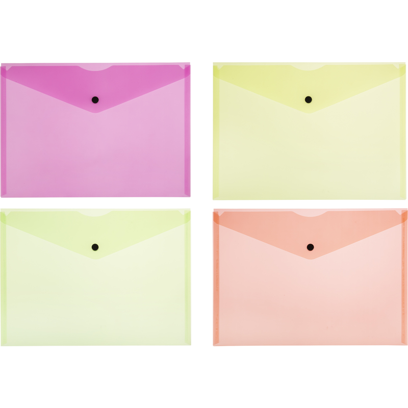 Папка-конверт формата А4 изготовлена из пластика толщиной 0.18 мм. Закрывается на кнопку. Вмещает до 120 листов. Удобна для хранения и переноски документов, предотвращает их смятие и загрязнение. Размер папки - 340x240 мм. Поставляется упаковками по 8 папок четырех цветов в упаковке. Цвета папок в упаковке- оранжевый, желтый, салатовый, розовый
