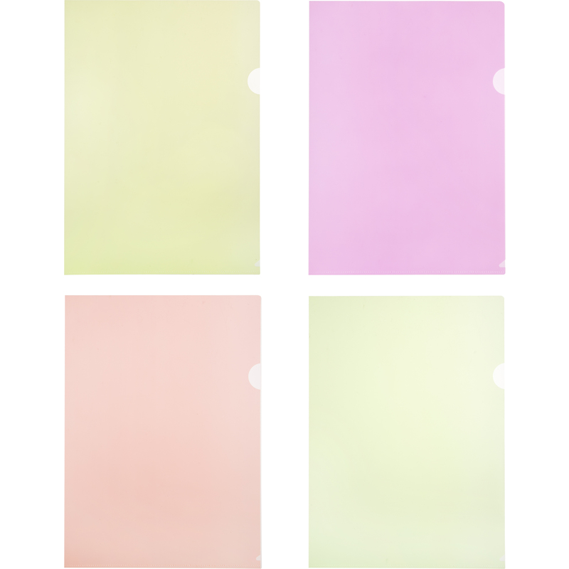 Папка-уголок формата А4 изготовлена из полипропилена. Толщина пленки - 180 мкм. Папка вмещает до 50 листов стандартной плотности. Поставляется упаковками по 8 папок четырех цветов в упаковке. Цвета папок в упаковке- оранжевый, желтый, салатовый, розовый
