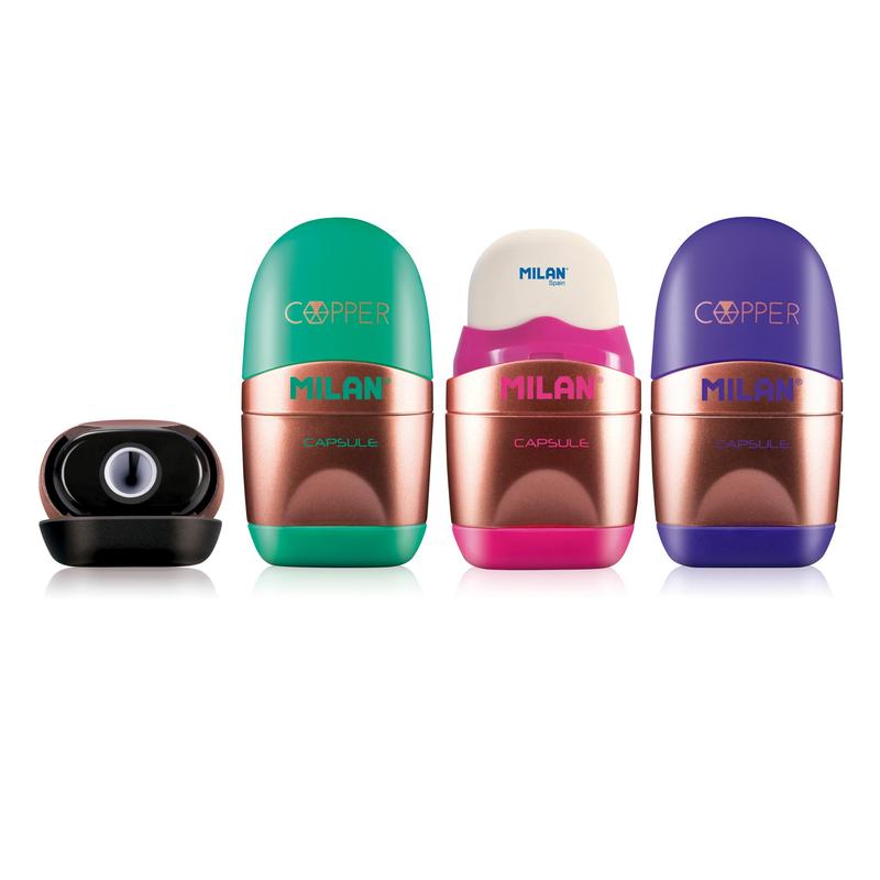 Комбинированная ластик-точилка для карандашей Milan Capsule Copper для детей и взрослых. Точилка для карандашей с одним отверстием имеет острое и прочное лезвие из углеродистой стали, что делает ее идеальной для всех видов карандашей. Точилка также имеет систему безопасных лезвий, которая предотвращает отсоединение лезвия от корпуса. Идеальна для школьного использования. Гибкий каучуковый ластик может использоваться для стирания графитных карандашей со всех типов бумаги. Ластик можно заменить на новый. Разработано в Испании собственным отделом исследований и разработок Milan. Внимание! Товар поставляется в нескольких вариантах дизайна (без возможности выбора).