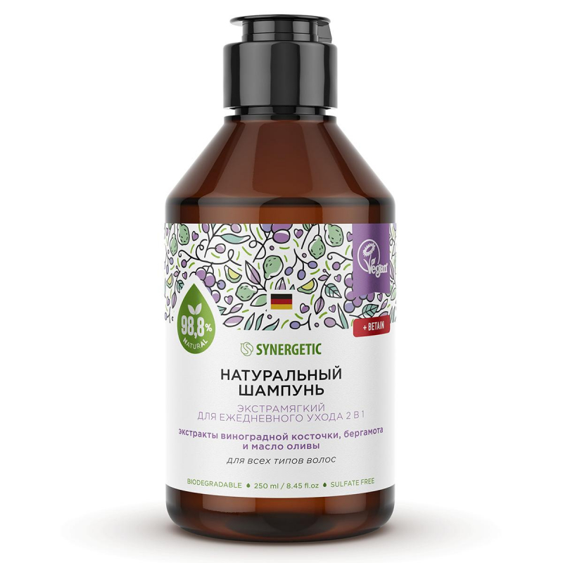 Шампунь для всех типов волос Synergetic "Экстрамягкий для ежедневного ухода 2 в 1" натуральный бессульфатный 250 мл. Назначение: Бессульфатный шампунь Synergetic "Экстрамягкий для ежедневного ухода 2 в 1" - эффективное средство для очищения кожи головы и всех типов волос - более чем на 98% состоит из натуральных компонентов. Шампунь деликатно очищает, эффективно ухаживает за волосами и защищает кожу головы. Благодаря формуле 2 в 1 бальзам в составе шампуня облегчает расчесывание, придает волосам эластичность, смягчает и увлажняет их. Формула с бетаином восстанавливает поврежденные волосы, укрепляет и стимулирует их рост. Натуральный шампунь содержит комплекс масел миндаля и оливы, который восстанавливает волосы, придает им мягкость и эластичность. Активные компоненты в составе шампуня укрепляют волосы и стимулируют восстановление кератиновых волокон. Экстракты виноградной косточки, бергамота и мелиссы нормализуют баланс кожи головы. Мультифункциональный компонент натурального происхождения софоролипид мягко очищает кожу головы и сохраняет естественный микробиом, а инновационный увлажняющий комплекс усиливает барьерные свойства кожи и обеспечивает до 72 часов глубокого увлажнения. Физиологичный уровень pH 5,5 устраняет сухость кожи головы и гарантирует безопасность при частом использовании средства даже для чувствительной кожи. Натуральный шампунь не содержит SLS, SLES, парабенов, силиконов, минеральных масел и красителей, а также компонентов животного происхождения, не тестируется на животных и сертифицирован британской организацией The Vegan Society. Знак Vegan - мировой стандарт этичной продукции. Способ применения: нанести небольшое количество шампуня на влажные волосы, хорошо вспенить и тщательно смыть водой. При необходимости повторить процедуру. Возможно появление естественного осадка натурального происхождения и незначительное изменение цвета шампуня, не влияющие на его качество и свойства. Меры предосторожности: при попадании в глаза промыть водой. Только для наружного применения. Оберегать от детей и животных. Хранить отдельно от еды. Состав: Aqua; Lauryl Glucosidex; Sodium Lauroyl Methyl Isethionate; Cocamidopropyl Betainex; Betainx (растительный увлажнитель); Candida Bombicola/Glucose/Methyl Rapeseedate Fermentx; Lauroyl/Myristoyl Methyl Glucamidex; Sweet Almond Oil Polyglyceryl-4 Estersx (масломиндаля); Olive Oil Polyglyceryl-4 Esterx (масло оливы); Citrus Aurantium Bergamia Fruit Extractx (экстракт бергамота); Melissa officinalis Flower/Leaf/Stem Extractx (экстракт мелиссы); Vitis Vinifera (Grape) Seed Extractx (экстракт виноградной косточки); Glycerinx; Coco Glucosidex; Glyceryl Oleatex; Sodium Cocoyl Isethionate; Triticum Vulgare (Wheat) Protein (протеины пшеницы); Saccharide Isomeratex; Hydroxypropylgluconamide; Hydroxypropylammonium Gluconate; Glycol Distearate; Glyceryl Stearatex; Guar Hydroxypropyltrimonium Chloridex; Sodium Benzoatex; Potassium Sorbatex; Parfum; Tetrasodium Glutamate Diacetatex; Sodium Citratex. ECOCERT approval. Условия хранения: хранить при температуре от +5 до +25 °С вдали от нагревательных приборов и огня. Не допускается хранение под непосредственным воздействием солнечного света. Срок годности: 36 месяцев с даты производства при соблюдении условий хранения.