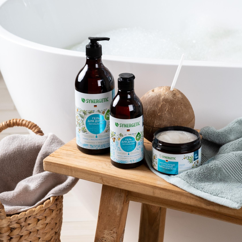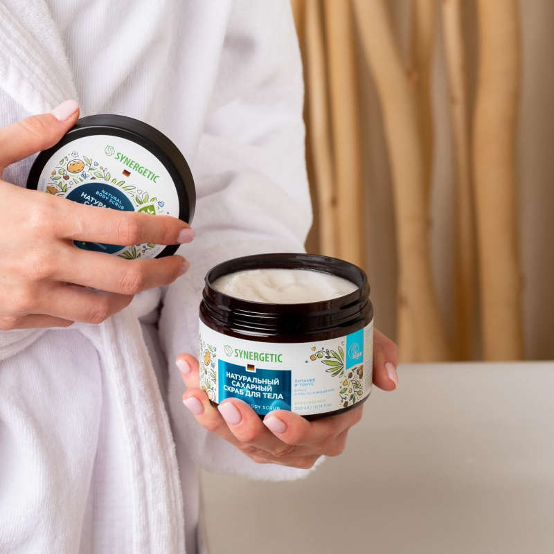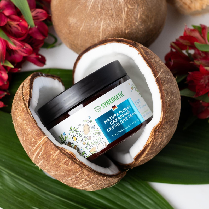 Скраб для тела Synergetic питание и тонус "Кокос и масло макадамии" сахарный натуральный 300 мл. Назначение: Натуральный сахарный скраб для тела Synergetic питание и тонус, кокос и масло макадамии - это эффективное средство для ухода за кожей, более чем на 99% состоящее из натуральных компонентов. Скраб деликатно отшелушивает кожу и оказывает массажный эффект. Масло кокоса в сочетании с кокосовой стружкой тонизируют кожу и придают ей упругость, а масло миндаля оказывает регенерирующее действие. Масло карите интенсивно питает, а экстракт франжипани и гилауроновая кислота увлажняют и ухаживают за кожей, делая ее гладкой и бархатистой. Гипоаллергенная парфюмерная композиция разработана в швейцарском доме Givaudan, где уже более ста лет создают ароматы, которые используются во всем мире в парфюмерии и косметике. Аромат натурального сахарного скраба для тела Synergetic с нотами кокоса, ванили и орехов оставляет на коже изысканный аромат. Способ применения: нанести скраб на влажную кожу, помассировать и тщательно смыть водой. Возможно отсекание масла и незначительное изменение цвета скраба, не влияющие на его качество и свойства. Меры предосторожности: при попадании в глаза промыть водой. Только для наружного применения. Оберегать от детей и животных. Хранить отдельно от еды. Состав: Sucrose (сахар), Glycerinx (увлажняющий компонент растительного происхождения), Cetearyl Alcoholx (натуральный загуститель), Butyrospermum Parkii Butterx (масло карите), Aqua (вода), Cocos Nucifera Fruit Powder (кокосовая стружка), Cocos Nucifera Fruit Oilx (масло кокоса), Sweet Almond Oil Polyglyceryl-4 Estersx (масло миндаля), Plumeria Alba Flower Extract (экстракт франжипани), Cocamidopropyl Betainex (мягкий ПАВ из кокосового масла), Hyaluronic Acidx (гиалуроновая кислота), Parfum (парфюмерная композиция на основе эфирных масел). ECOCERT approval. Условия хранения: хранить при температуре от +5 до +25 °С вдали от нагревательных приборов и огня. Не допускается хранение под непосредственным воздействием солнечного света. Срок годности: 36 месяцев с даты производства при соблюдении условий хранения.