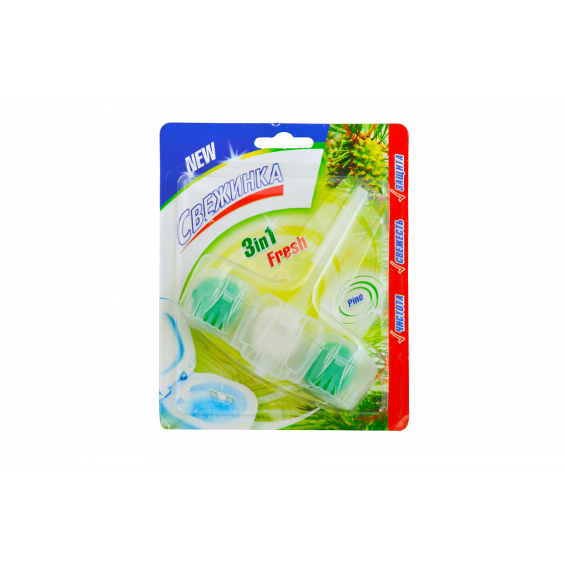 Блок для унитаза гигиенический Свежинка 3in1 Fresh Pine. Назначение: одновременно моющее и освежающее средство для унитаза длительного действия. Специально подобранные компоненты трех део-блоков обеспечивают гигиеническую чистоту и свежесть, устраняют загрязнения унитаза, уничтожают бактерии, предупреждают отложение осадков в труднодоступных местах, создают обильную пену и приятный запах при смывании. Доказательство эффективности - аромат и пена в Вашем туалете! Способ применения: вынуть из упаковки, повесить на край унитаза в пределах досягаемости водной струи. Меры предосторожности: храните средство в местах, недоступных для детей и домашних животных. Состав: соли неорганических кислот 45% и более, но менее 50%, анионные поверхностно-активные вещества 35% и более, но менее 45%, краситель 5% и более, но менее 7%, ароматические компоненты менее 5%. Условия хранения: хранить при температуре от -35 °С до 35 °С, избегая попадания прямых солнечных лучей.Срок годности: 36 месяцев с даты изготовления (см. на упаковке).