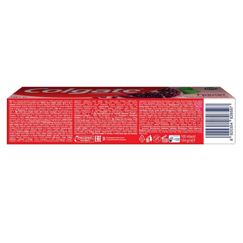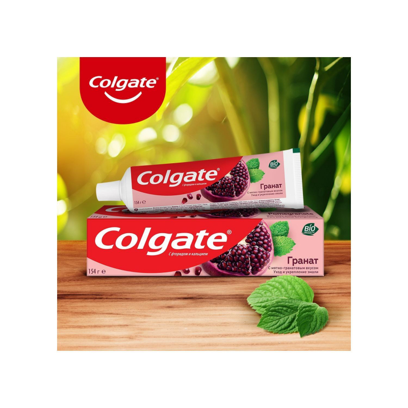 Зубная паста Colgate Гранат с мятно-фруктовым вкусом укрепляет и заботится об эмали зубов, защищает от кариеса. Плоды граната - это кладезь витаминов и полезных веществ, они славятся своим ярким вкусом и общеукрепляющими, противовоспалительными свойствами. Произведено с заботой, чтобы Вы могли чаще улыбаться: - без глютена; - Bio экстракты (Bio в отношении экстрактов означает их натуральность); - ответственное производство; - одобрено Стоматологической Ассоциацией России. Состав: calcium carbonate, aqua, sorbitol, hydrated silica, sodium lauryl sulfate, aroma, sodium monofluorophosphate, cellulose gum, magnesium aluminum silicate, sodium carbonate, sodium saccharin, benzyl alcohol, sodium bicarbonate, mangifera indica juice, punica granatum fruit juice, mentha viridis leaf oil, eugenol, limonene, ci 16035, ci 77492.