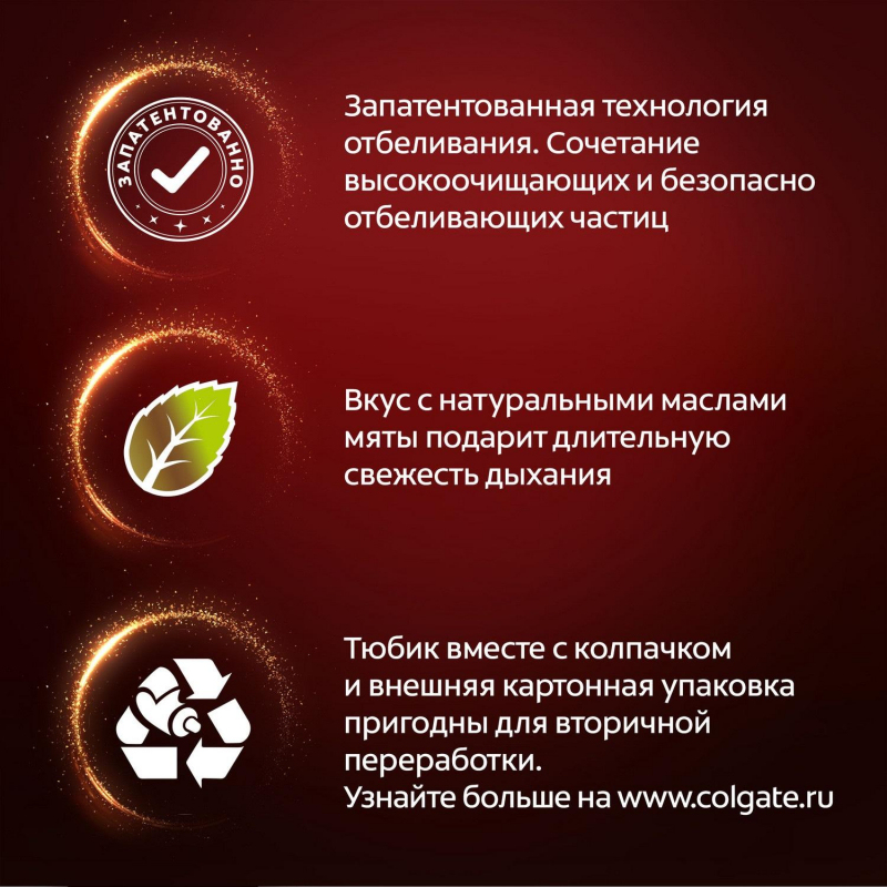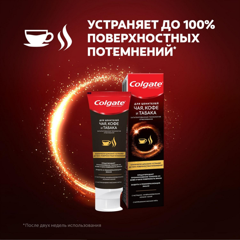 Зубная паста Colgate отбеливающая для ценителей чая, кофе и табака превосходно устраняет пятна от чая, кофе и табака благодаря сочетанию высокоочищающих и безопасно отбеливающих частиц. Препятствует проникновению танинов из кофе и чая в поверхность эмали. Реминерализирует и защищает эмаль. Специальная отбеливающая формула содержит минералы природного происхождения, на основе фосфора. Вместе с частицами, минерализованными ионами калия, они формируют минеральный слой на эмали, защищающий от потемнений от чая, кофе и никотина. Вкус с натуральными маслами мяты подарит длительную свежесть дыхания. Тюбик вместе с колпачком и внешняя картонная упаковка пригодны для вторичной переработки. Состав: Aqua, Hydrated Silica, Sorbitol, PEG-12, Pentasodium Triphosphate, Tetrapotassium Pyrophosphate, Aroma, Sodium Lauryl Sulfate, Cellulose Gum, Potassium Hydroxide, Phosphoric Acid, Cocamidopropyl Betaine, Sodium Fluoride, Sodium Saccharin, Xanthan Gum, Mentha Piperita Oil, Mentha Viridis Leaf Oil, Limonene, CI 74160. Contains: Sodium Fluoride Total Fluoride content: 1450 ppm.