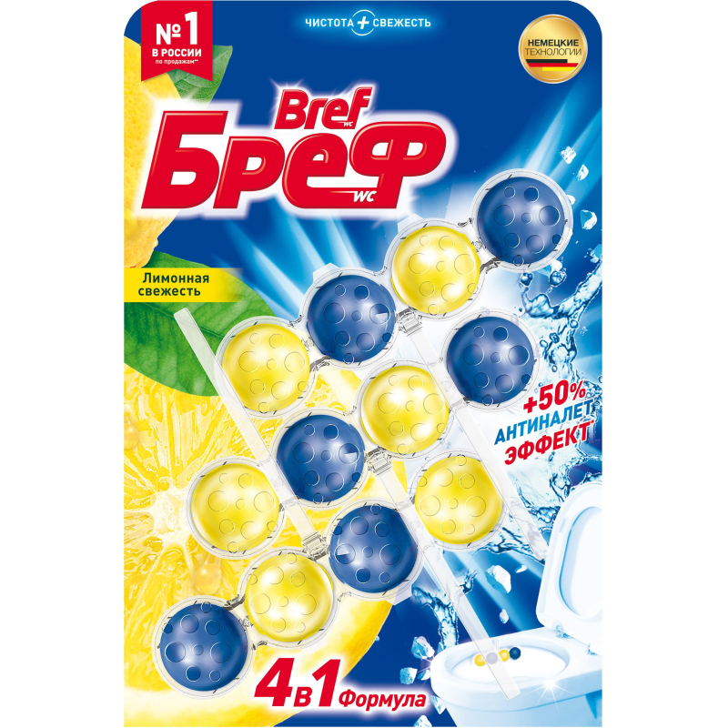 Туалетный блок Bref Сила-Актив "Лимонная свежесть" - это подвесной блок для унитаза с формулой 4в1, которая обеспечивает: 1. Гигиеническую чистоту. 2. Защиту от известкового налета. 3. Лимонную свежесть. 4. Обильную пену. Уникальная формула 4в1 туалетного блока для унитаза Bref Сила-Актив обеспечивает гигиеническую чистоту, защиту от известкового налета, обильную пену и свежий аромат. Просто закрепите туалетный блок для унитаза под ободком унитаза рядом со струей воды и наслаждайтесь насыщенной свежестью и чистотой Вашего туалета с каждым смыванием! Продукция Bref отвечает за гигиеническую чистоту и свежесть Вашего туалета и ванной комнаты. Чистящим средствам для туалета и ванной комнаты Bref по силам справиться с самыми серьезными проблемами и устранить ржавчину, известковый налет и различные загрязнения. Средства для унитаза Bref помогут Вам поддерживать чистоту и свежесть туалета между генеральными уборками до 4 недель. Состав: вода 10%, отдушка 20%, растворители 20%, красители 10%, неионные пав 15%, содовый комплексообразователь 10%, анионные пав 15%.