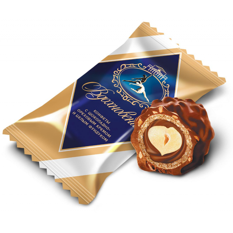 Конфеты 'Вдохновение' с шоколадно-ореховым кремом - маленькая планета утонченного вкуса. Воздушный вафельный шарик, наполненный нежным шоколадно-ореховым кремом, внутри которого - цельное ядрышко фундука. Сладкая 'планета' покрыта бугристым слоем шоколадной глазури, начиненной осколками лесных орехов. Классический вкус шоколада 'Вдохновение' с яркими ореховыми оттенками. Состав: шоколадная глазурь (сахар, какао тертое, эквивалент масла какао (рафинированные, дезодорированные, фракционированные, негидрогенизированные растительные масла (пальмовое, ши)),какао-порошок, эмульгаторы: лецитин соевый, Е476; ароматизатор 'Ваниль'), сахар, вафли (вода питьевая, мука пшеничная хлебопекарная высшего сорта,какао-порошок, сахар, эмульгатор лецитин соевый, соль, масло подсолнечное рафинированное дезодорированное, разрыхлитель - гидрокарбонат натрия), жир специального назначения (негидрогенизированные растительные масла: пальмовое, ши), ядро ореха фундука целое, ядро ореха фундука дробленое, ядро ореха фундука тертое, какао-порошок, сухое цельное молоко, какао тертое, эмульгатор лецитин соевый, ароматизатор 'Шоколадно-ореховый'. Противопоказано при индивидуальной непереносимости белка молока. Возможно наличие незначительного количества миндаля, арахиса. Пищевая ценность на 100г продукта, г: белки - 6,5; жиры - 34; углеводы - 51. Энергетическая ценность: 550 Ккал. Хранить при температуре от 15 до 21 °С и относительной влажности воздуха не более 75%. Не подвергать воздействию прямого солнечного света. Страна производства: Россия.