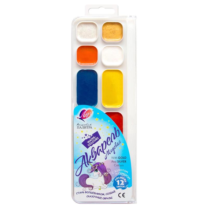 Высококачественная краска для детского творчества, изготовленная по классической рецептуре с использованием меда. Яркие, чистые цвета. В наборе две кюветы с акварелью цвета "золотистый" и "серебристый". Акварель прекрасно размывается и разносится по поверхности бумаги. Легко наполняется на кисть. Часто используемые цвета в увеличенных кюветах. Краска легко смывается с рук и одежды. Безопасна для детей. Срок годности не ограничен. В наборе присутствует белый цвет. Вид акварели - полусухая. Упаковка - пластиковое донышко с прозрачной крышкой, материал - полистирол, с европодвесом. Размер 232x76x14 мм.