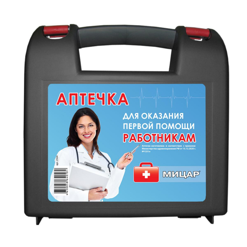 Аптечка первой помощи Мицар (по приказу № 11331н). Состав: 1. Маска медицинская нестерильная одноразовая: 10 шт. 2. Перчатки медицинские нестерильные, размером не менее М: 2 пары. 3. Устройство для проведения искусственного дыхания "Рот-Устройство-Рот": 1 шт. 4. Жгут кровоостанавливающий для остановки артериального кровотечения: 1 шт. 5. Бинт марлевый медицинский размером не менее 5 м х 10 см: 4 шт. 6. Бинт марлевый медицинский размером не менее 7 м х 14 см: 4 шт. 7. Салфетки марлевые медицинские стерильные размером не менее 16x14 см № 10: 2 уп. 8. Лейкопластырь фиксирующий рулонный размером не менее 2x500 см: 1 шт. 9. Лейкопластырь бактерицидный размером не менее 1,9x7,2 см: 10 шт. 10. Лейкопластырь бактерицидный размером не менее 4x10 см: 2 шт. 11. Покрывало спасательное изотермическое размером не менее 160x210 см: 2 шт. 12. Ножницы для разрезания повязок: 1 шт. 13. Инструкция по оказанию первой помощи с применением аптечки для оказания первой помощи работникам: 1 шт. 14. Футляр: 1 шт. Аптечка с наполнением, относится к сегменту "эконом". Качество соответствует требованиям нормативных документов.