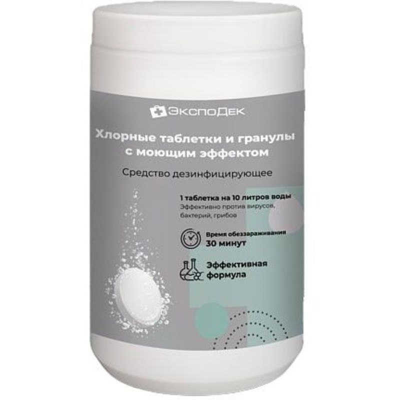 Средство для дезинфекции поверхностей и оборудования Эксподек Хлор 1 кг. Назначение: быстрорастворимые, цилиндрические таблетки белого цвета с характерным запахом хлора. Для проведения текущей, заключительной и профилактической дезинфекции в лечебно-профилактических организациях, коммунально-бытового обслуживания, торговых, развлекательных центрах любого профиля, продовольственных и промышленных рынках, учреждениях образования, культуры, отдыха, спорта. Учреждениях социального обеспечения, на объектах жизнедеятельности воинских частей и соединений. В детских учреждениях и на предприятиях общественного питания и торговли, предприятиях пищевой промышленности, на объектах транспортной системы, населением в быту. Состав: в качество действующего вещества - натриевая соль дихлоризоциануровой кислоты. Срок годности: 5 лет (рабочих растворов 25 суток).