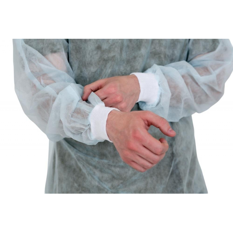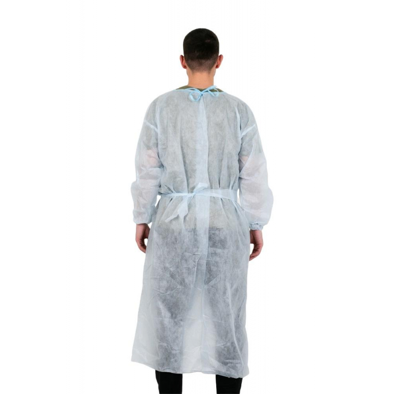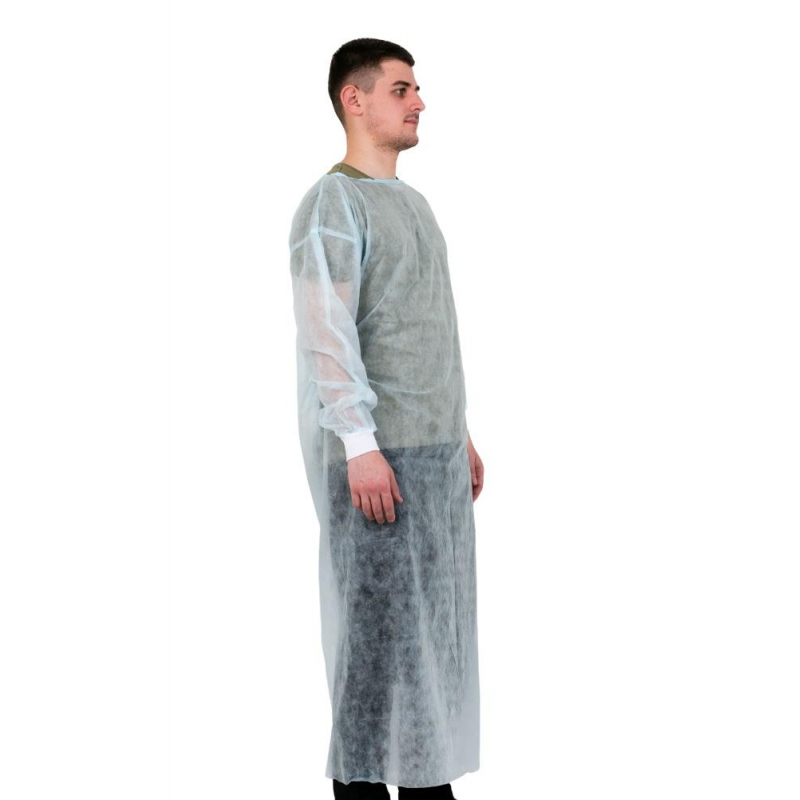 Одноразовые хирургические халаты, предназначенные для защиты врачей и пациентов с целью предохранения пациента и медицинского работника от переноса микроорганизмов и жидкостей. Потенциальные потребители: работники и посетители учреждений здравоохранения. Халаты выпускаются в нестерильном виде, производятся из гипоаллергенных материалов с учетом всех санитарно-гигиенических требований. Размер халатов: XXL. Длина халатов: 140 см. Халаты на двух завязках на поясе и завязках на горловине. Длинный рукав халатов собран на манжету. Халаты голубого цвета.