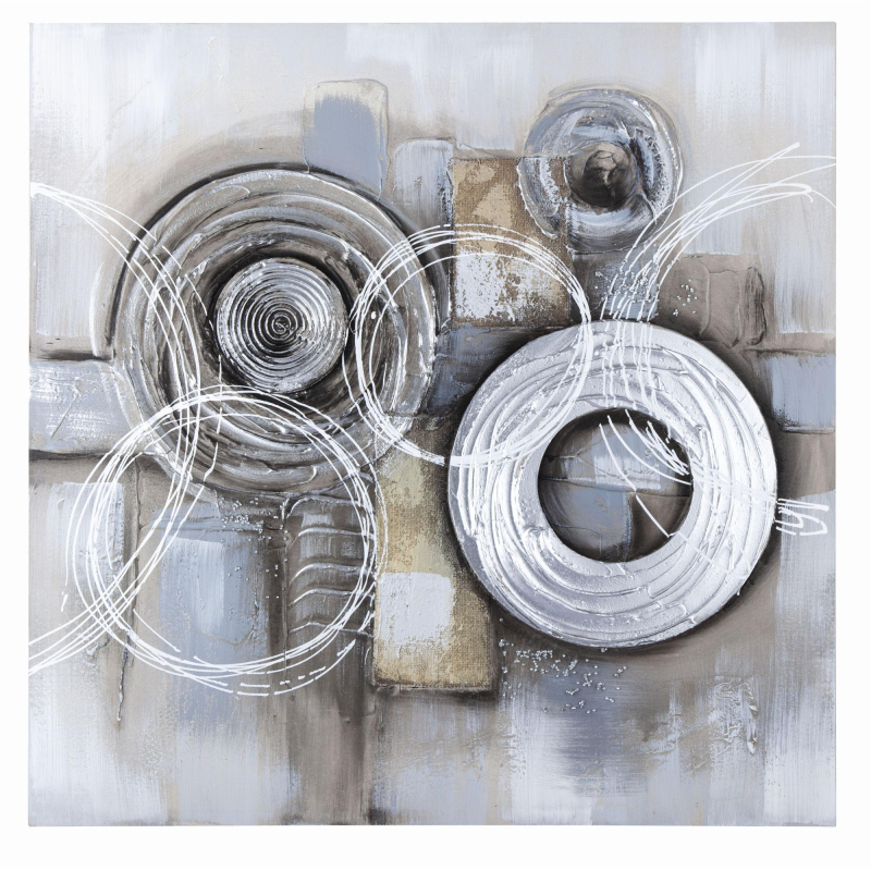 Фактурная картина с абстрактным геометрическим сюжетом. Картина выполнена путем нанесения на холст декоративной шпатлевки, рогожки, вспененного полистирола и страз. Подрамник выполнен из массива дерева. Размеры: 80х3х80 см.